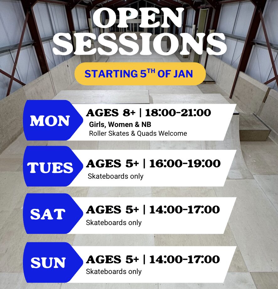 Our open sessions give you three hours of relaxed indoor skate time in a safe and friendly environment. Come to practise tricks, cruise around, or just enjoy the park with your friends.